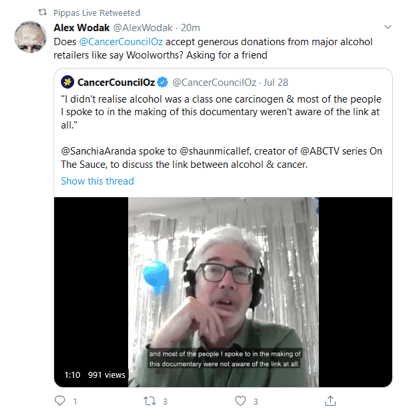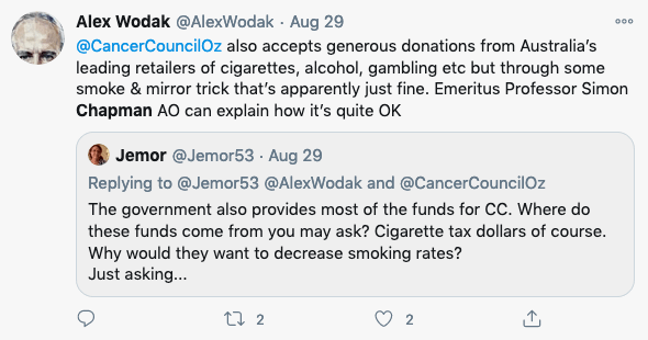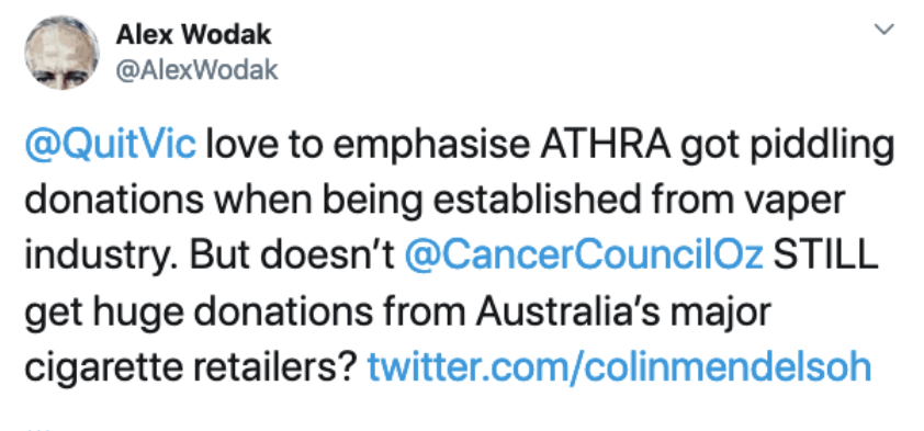 Perhaps smarting at journalists who frequently (and appropriately) question potential commercial influences on ATHRA’s policy positions, Wodak has been busy claiming on Twitter that the Cancer Council takes “HUGE donations from major national retailers of cigarettes”. He also retweeted this claim that Woolworths alone had donated $2m. In fact, he has tweeted references to the Cancer Council takes money from tobacco and alcohol retailers six times in the last nine days.