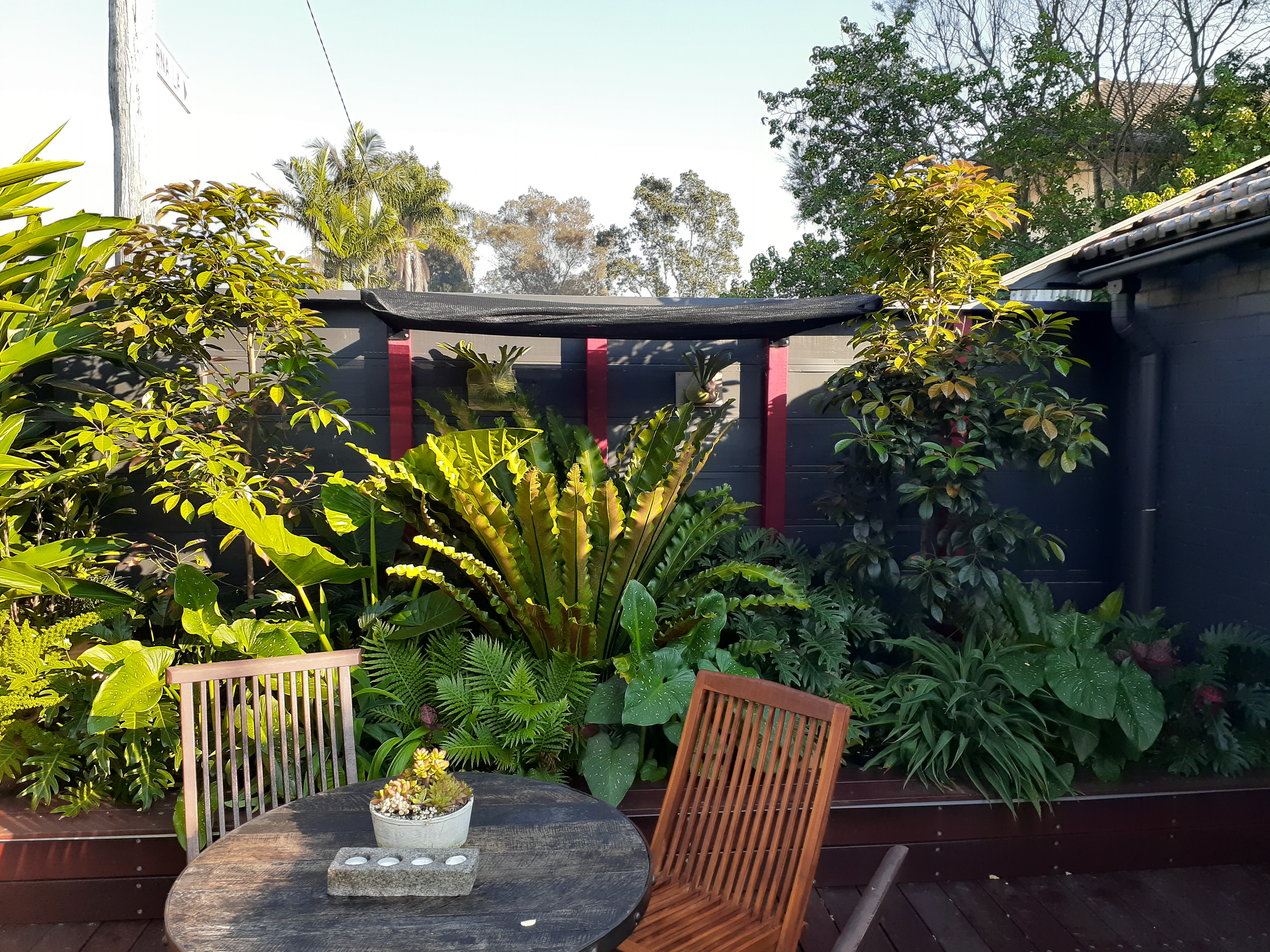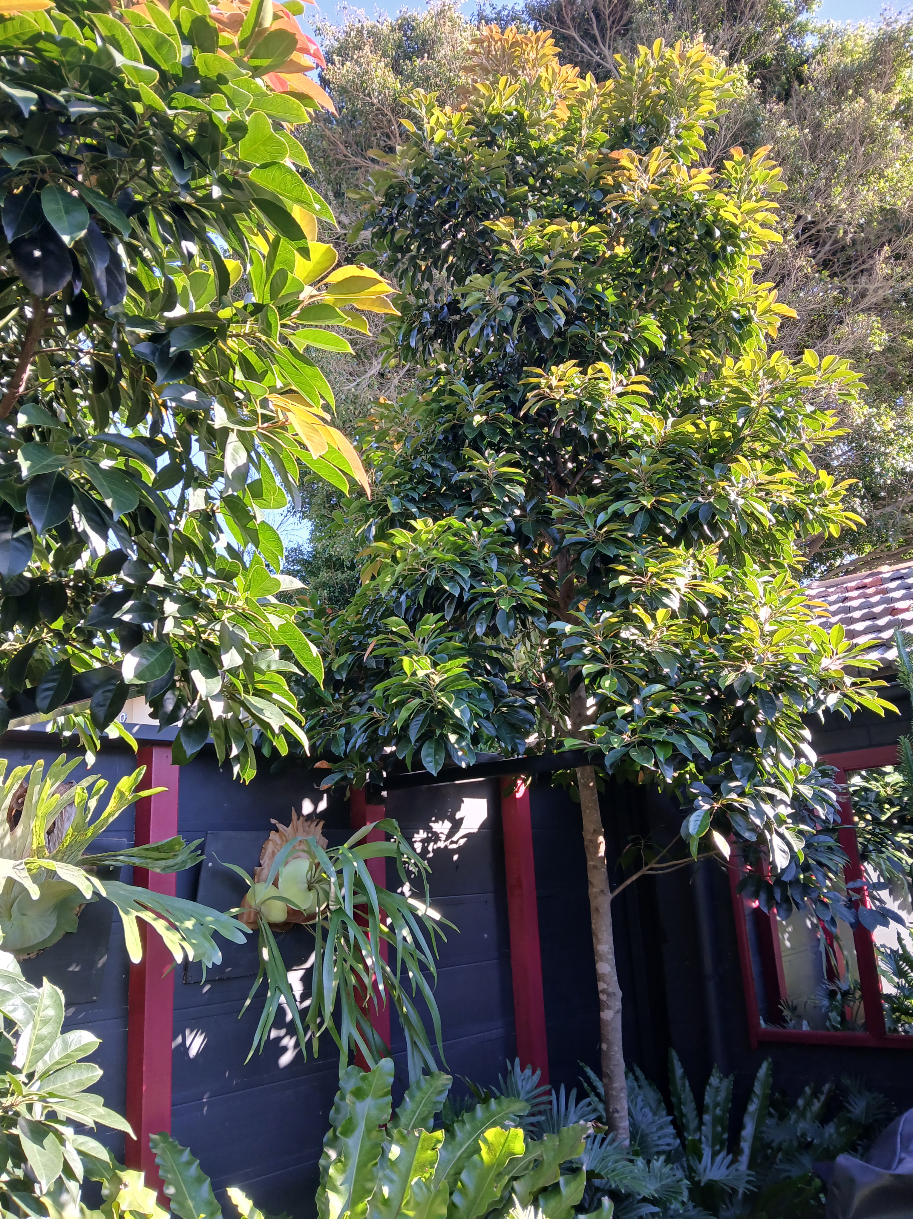 When permission was given, we had the tree removed ($6400), and as required, we planted a replacement. We renovated the back garden and in a 1m raised garden bed planted two 1.5m native evergreen eumundi quandong trees (Elaecarpus emundi) which will grow to 12-25m.