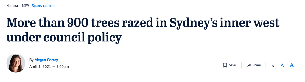 Between February 2020 and March 2021, 915 trees were removed. This was more than double the 373 felled in 2019 and 409 that came down in 2018. The Inner West’s tree canopy had fallen to 17.56%, against a Sydney-wide average of 23%. Self-evidently a shocking state-of-affairs?
