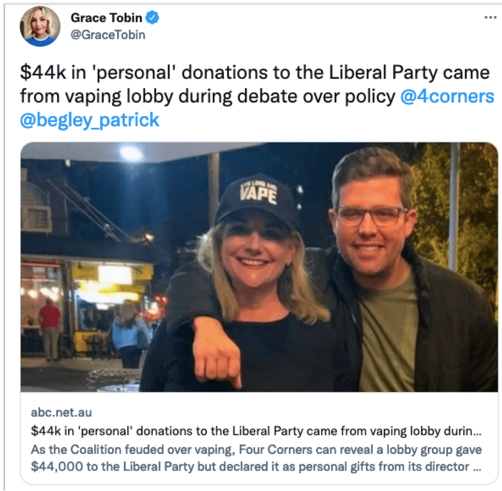 In the Abbott-Turnbull-Morrison years, Australian vaping advocates were on speed dial with go-to right wing political supporters to tap for favours. After the 2022 federal election conservative bloodbath, many of those supporters are now political feather dusters (Abetz, Wilson, Falinski, Sharma, Laming, Stoker, Zimmerman, McMahon) or political eunuchs like Matt Canavan and the unforgettable Hollie Hughes.