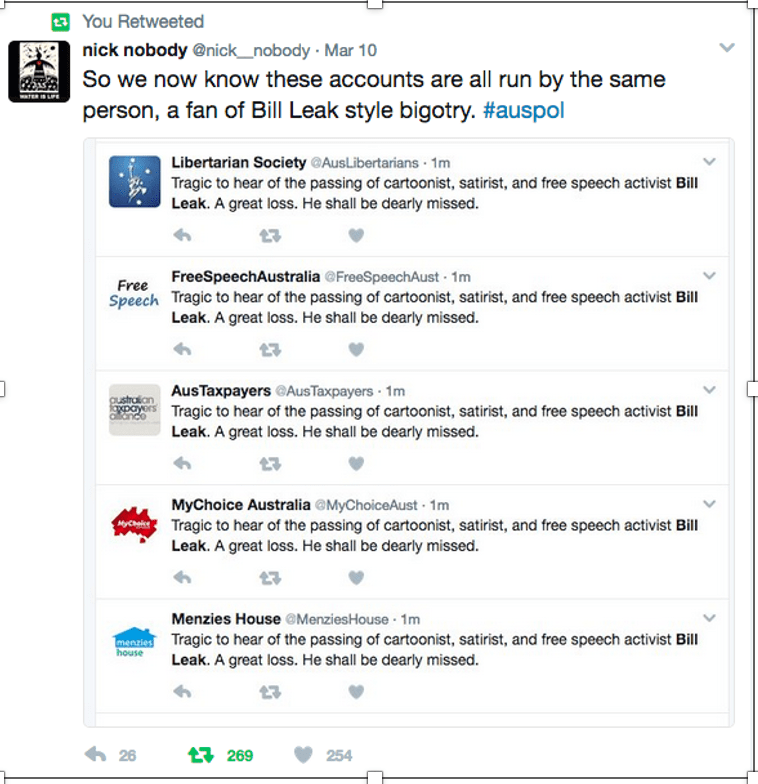 When Marlow referred to “his organisation”, he was likely talking about the Australian Taxpayers Alliance (ATA), where he was a member of the “team” before taking the reins as its “president”. LVA is just one of several campaigns run under the umbrella of the ATA. As shown in this tweet posted just after the death of right-wing cartoonist Bill Leak in 2016, identical tweets were posted by five ATA-affiliated groups.