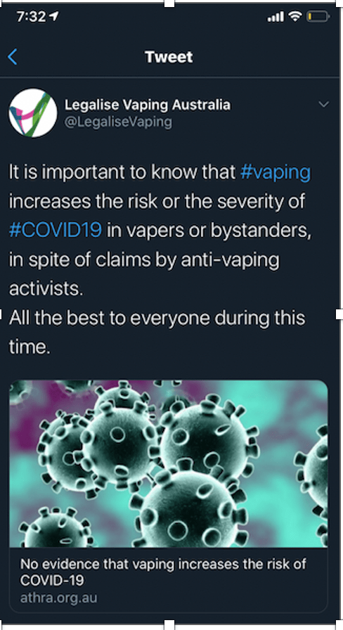 Australian Vaping Association Started up in June 2020 and managed 80 tweets until Oct 15, 2020 to its 146 followers. Never sighted since.