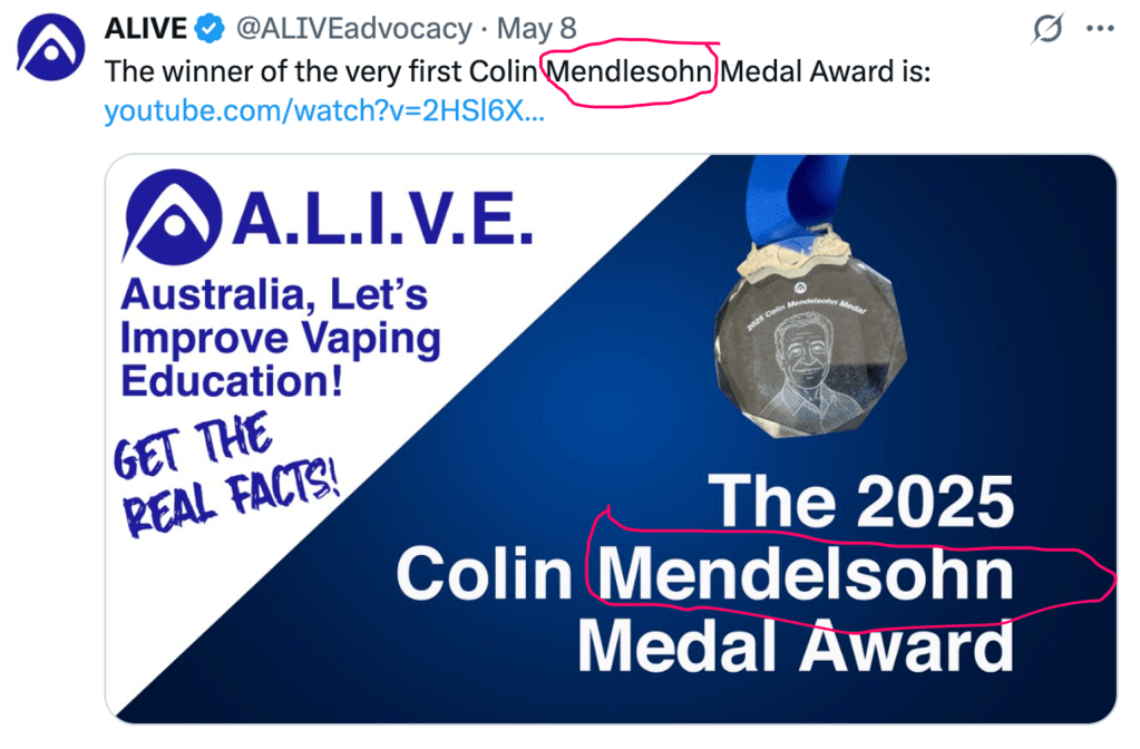 In May 2025, after dramatic music Pippa breathlessly announced to the world on youtube that ALIVE had set up the “Colin Mendelsohn Medal Award”, although they seemed unsure of the spelling of his name. The award went to one of its stalwarts, Alan (Al) Gore the public name of vaper, advocate and submission writer Alan Gorley. Pippa described the award as “an amazing thing for you to wear around your neck, proudly … an unbelieveable and prestigious award.”