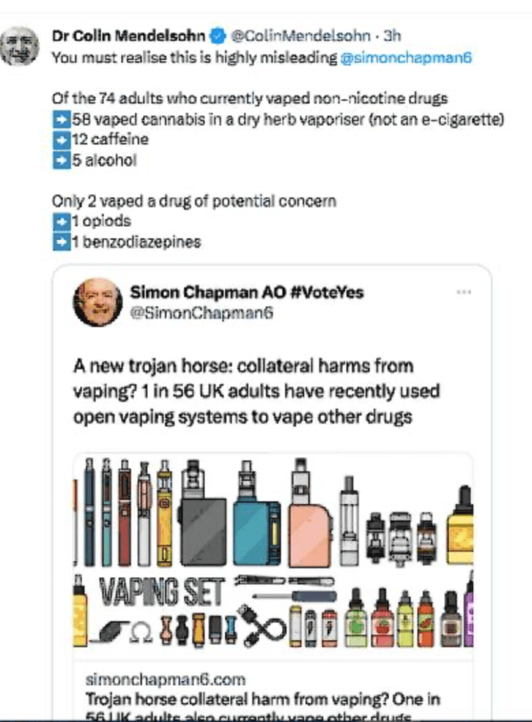 Australia’s vaping advocates, like the tobacco industry before them, are totally marginalised in political circles with any power. Their public voices are confined to a diminishing number of news outlets, to social media echo chambers, blogs and personal videos with mostly desultory viewing numbers. Without exception, Big Tobacco has lost every policy battle it fought. Vaping promoters are on the same trajectory. Their regular splenetic ranting at anyone not sharing their vaping theology precepts is seeing their credibility evaporate. Keep it up, guys.