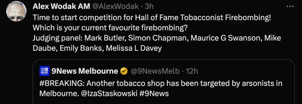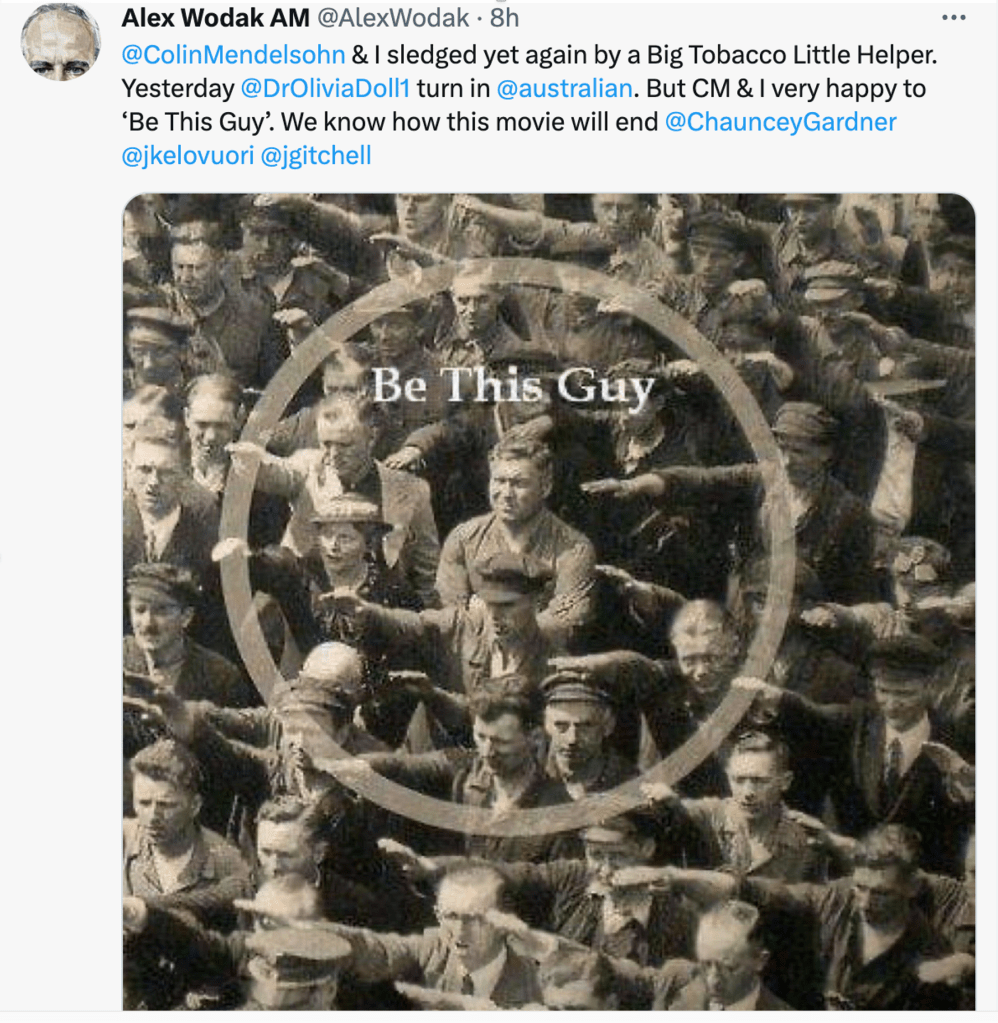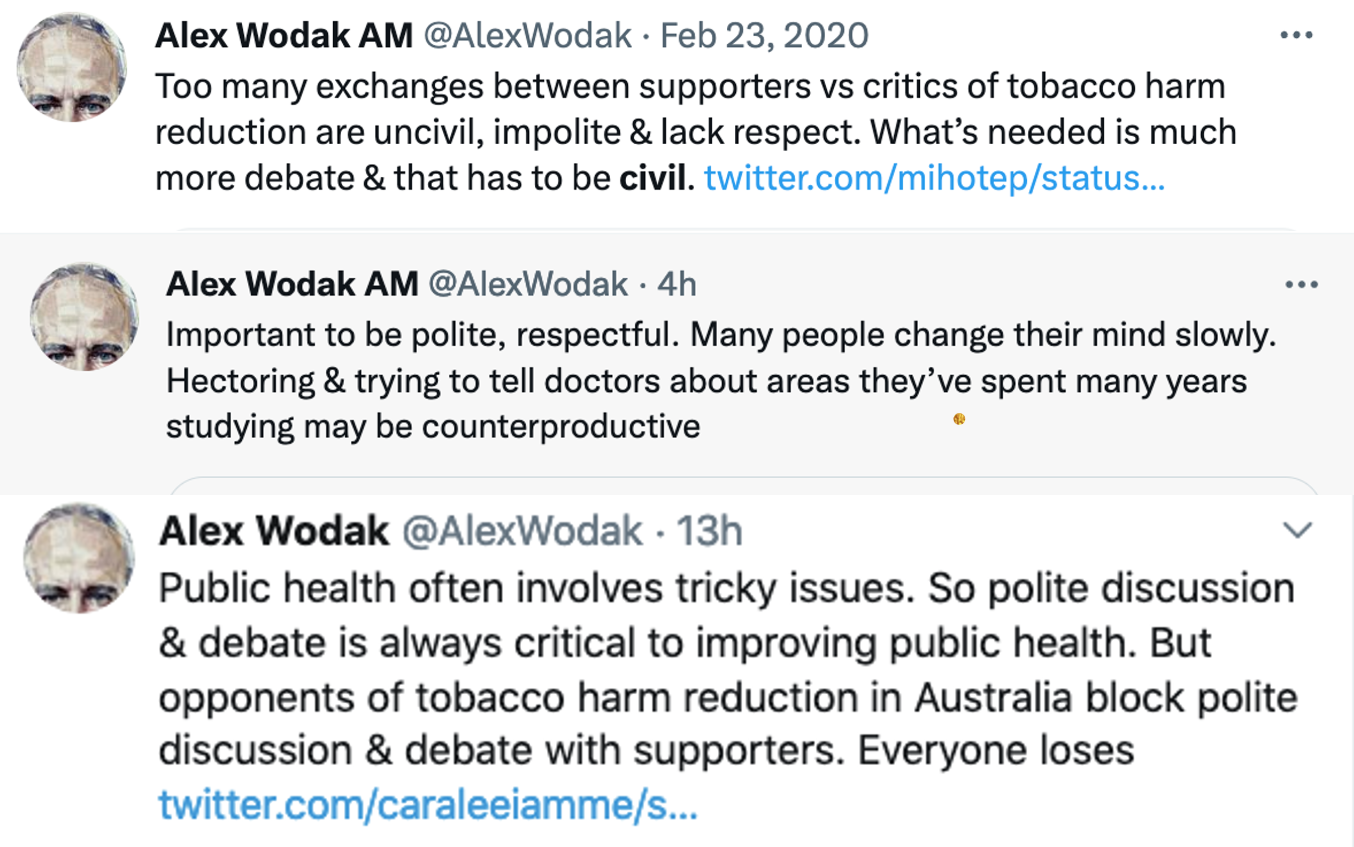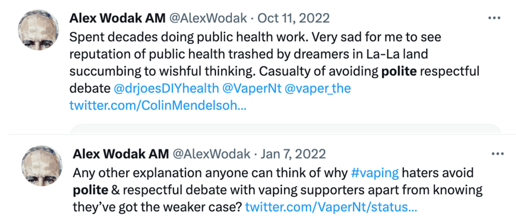 On 29 January 2023, thirsty for polite, respectful debate, Wodak published the tweet below, responding to a tweet posted by the Northern Territory Seniors for Tobacco Harm Reduction (yes, there really is such an account).