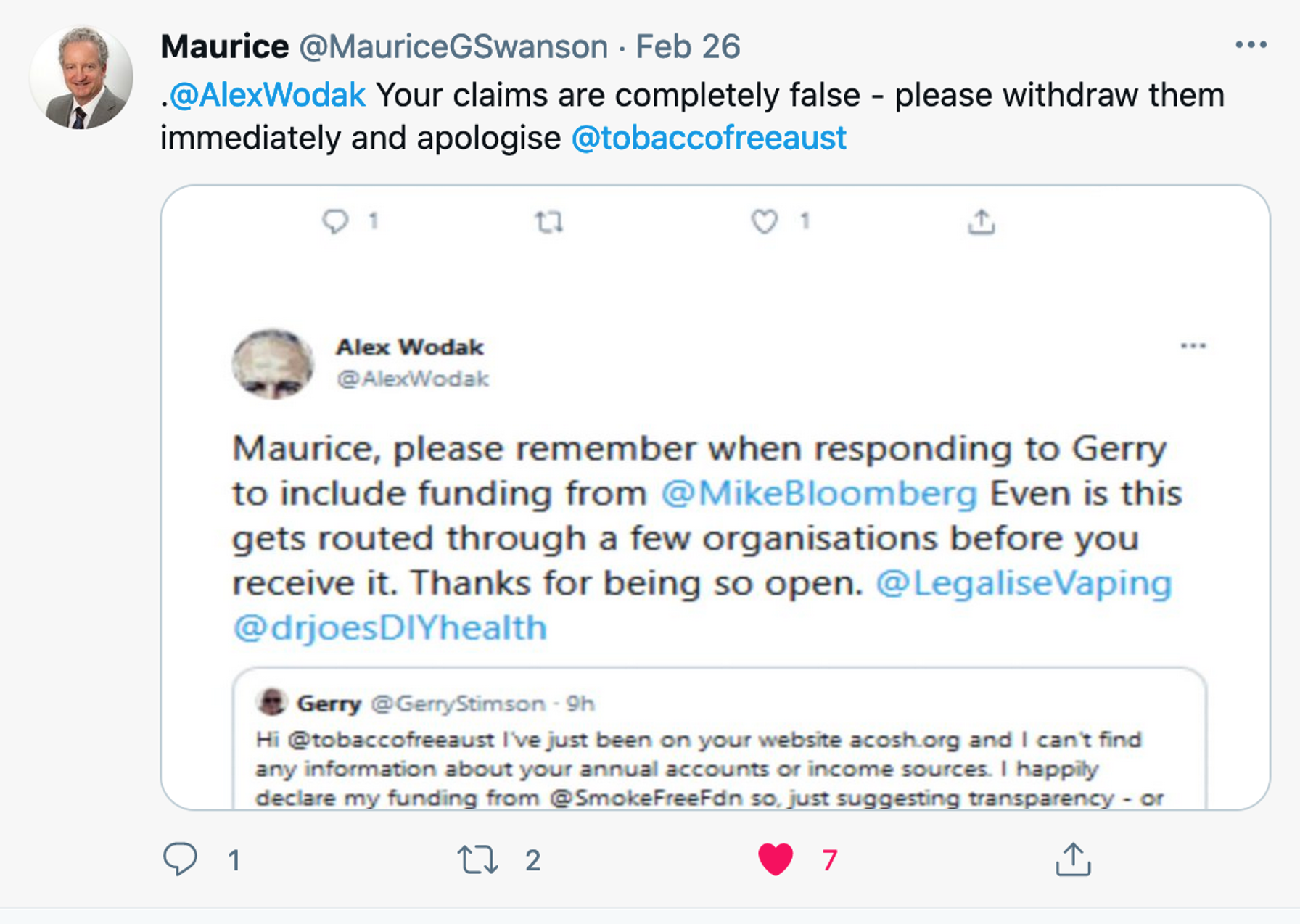 He retweeted a tweet claiming my university (and therefore me presumably) also took money from Bloomberg and a Chinese Research Centre to critique vaping, when neither was in any way true.