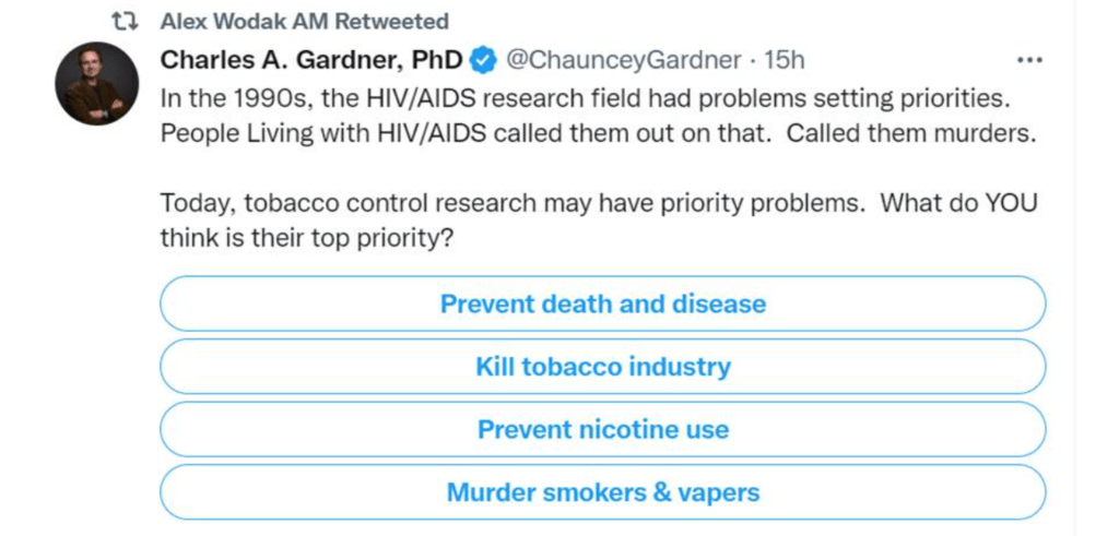 He retweeted some miscreant’s twitter push poll inviting people to vote that tobacco control researchers’ highest priority was to “murder smokers & vapers” (below).