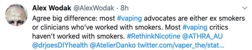 Another who responded to the Northern Territory Seniors tweet was @vapelawguy from the USA, a brave anonymous keyboard vape warrior with all of 535 followers. Wodak republished it in a retweet (see below)