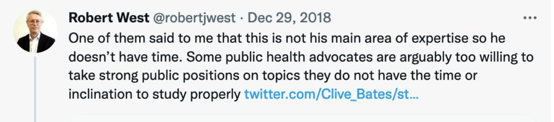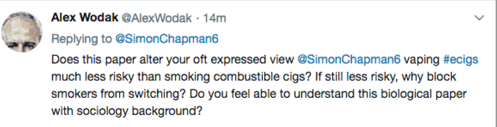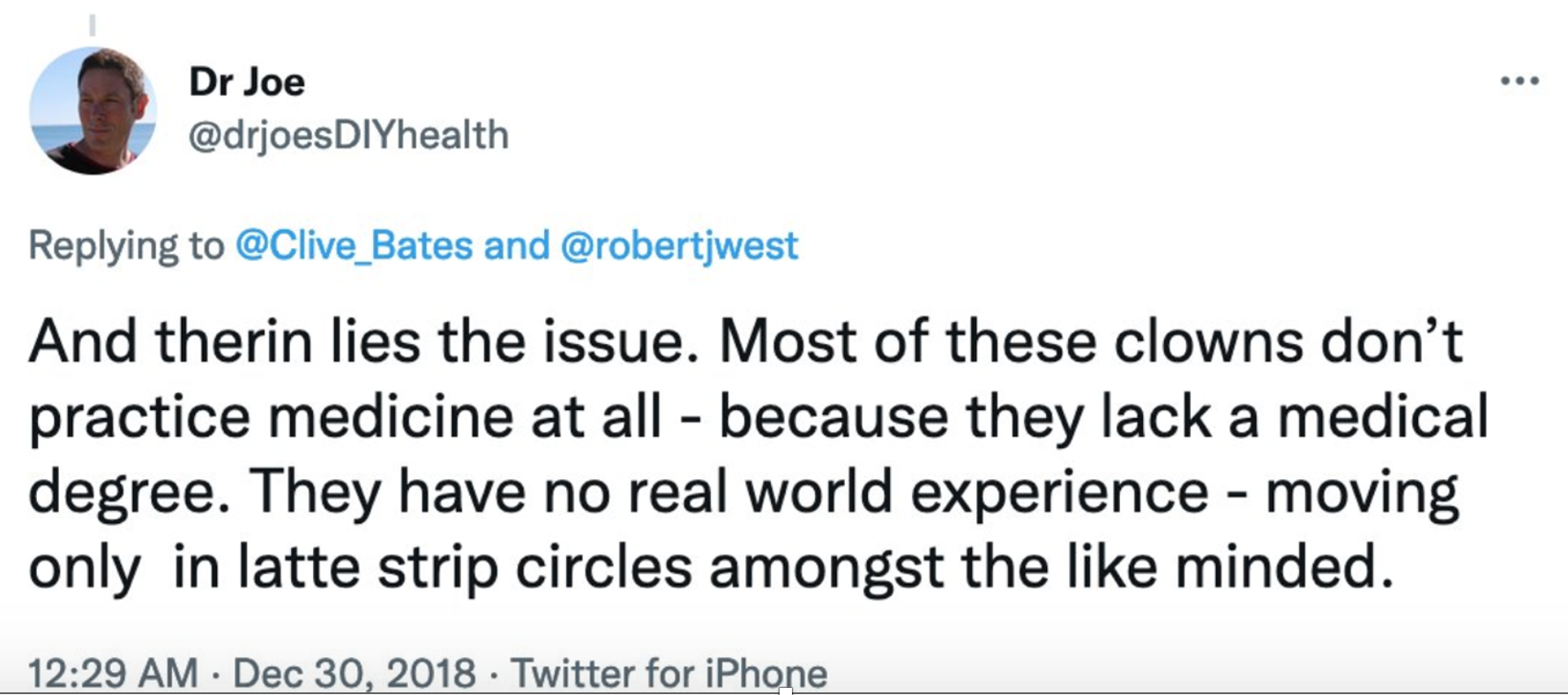 His co-director Joe Kosterich at ATHRA, the vaping lobbying group that today has three directors and no members and which hasn’t put out a press release on its website for 42 months, went one better with this little cracker below, when interacting with a post from England’s Prof Robert West who (whoops!) has no medical qualifications.
