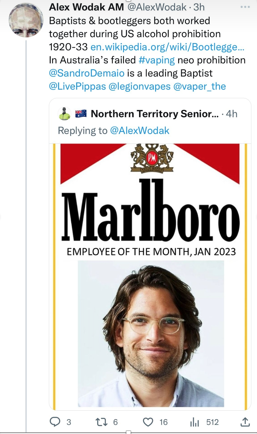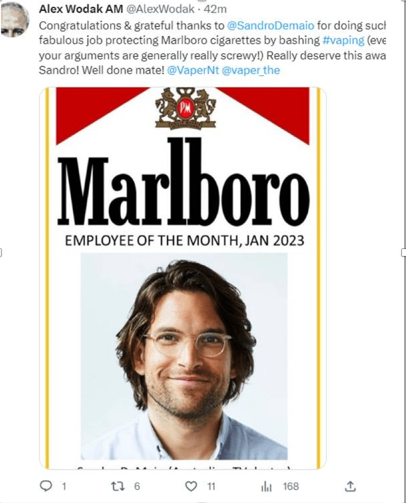 The Northern Territory Seniors tweet proposed that Demaio ought to be thought of as a valued Marlboro (a Philip Morris brand) employee because, presumably, they would just love his efforts to support the prescription-only access to vapes. Philip Morris International sells its IQOS NVPs internationally and wants nothing to do with prescription access.