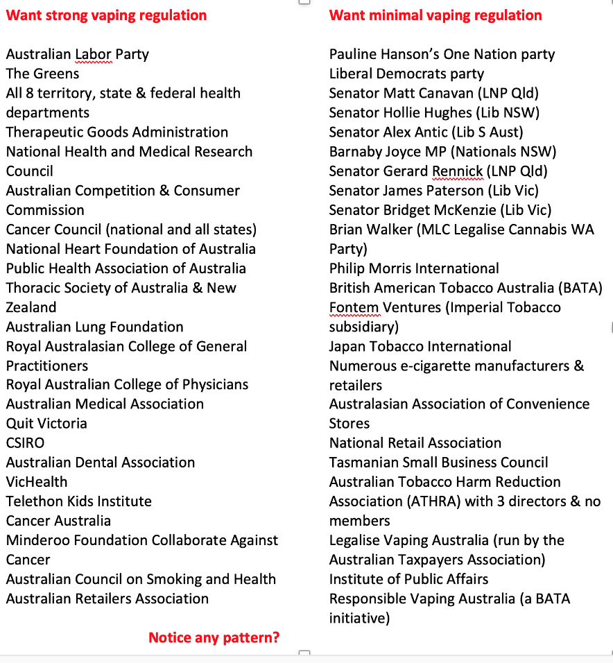 Sandro Demaio was clearly playing deep inside Wodak’s head. Demaio is an articulate, evidence-based advocate with vast experience in advocacy. Wodak did not seem to realise that Philip Morris (Marlboro) is implacably opposed to NVPs being available only through prescription access. Philip Morris have never submitted an application to sell their NVPs via TGA authority. They and all Big Tobacco companies are fully committed to the “consumer model”, in lockstep with Wodak and those shown in the right hand column of the table above.