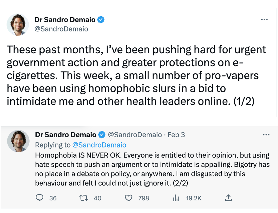 In public health advocacy, you need to grow rhino hide. But vaping fanatics are the next level. Here’s a selected list of some of the worst examples targeted at me that I put aside some 5 years ago. I’ve long blocked activist vaping trolls after relentless, insistent streams. I explain why here.