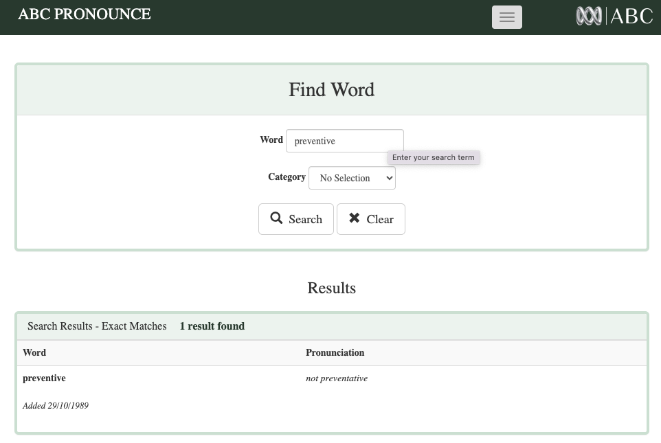 I write to draw attention to the pernicious creep of “preventative” instead of “preventive” in what the ABC broadcasts. Your pronunciation standards guide, ABC Pronounce, formally notes that “preventive”, not preventative be used. This ruling has been in place since 1989.