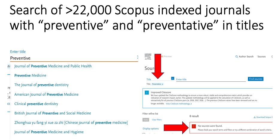 Scopus, the scientific world’s largest and most respected scholarly reference service indexes over 22,000 journals. Not one of these has the word “preventative” in its title, but there are 10 with “preventive” (see https://www.scopus.com/sources.uri)