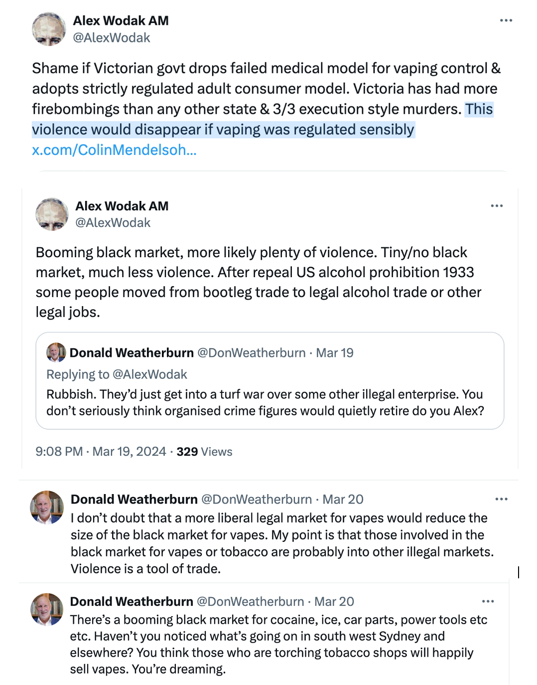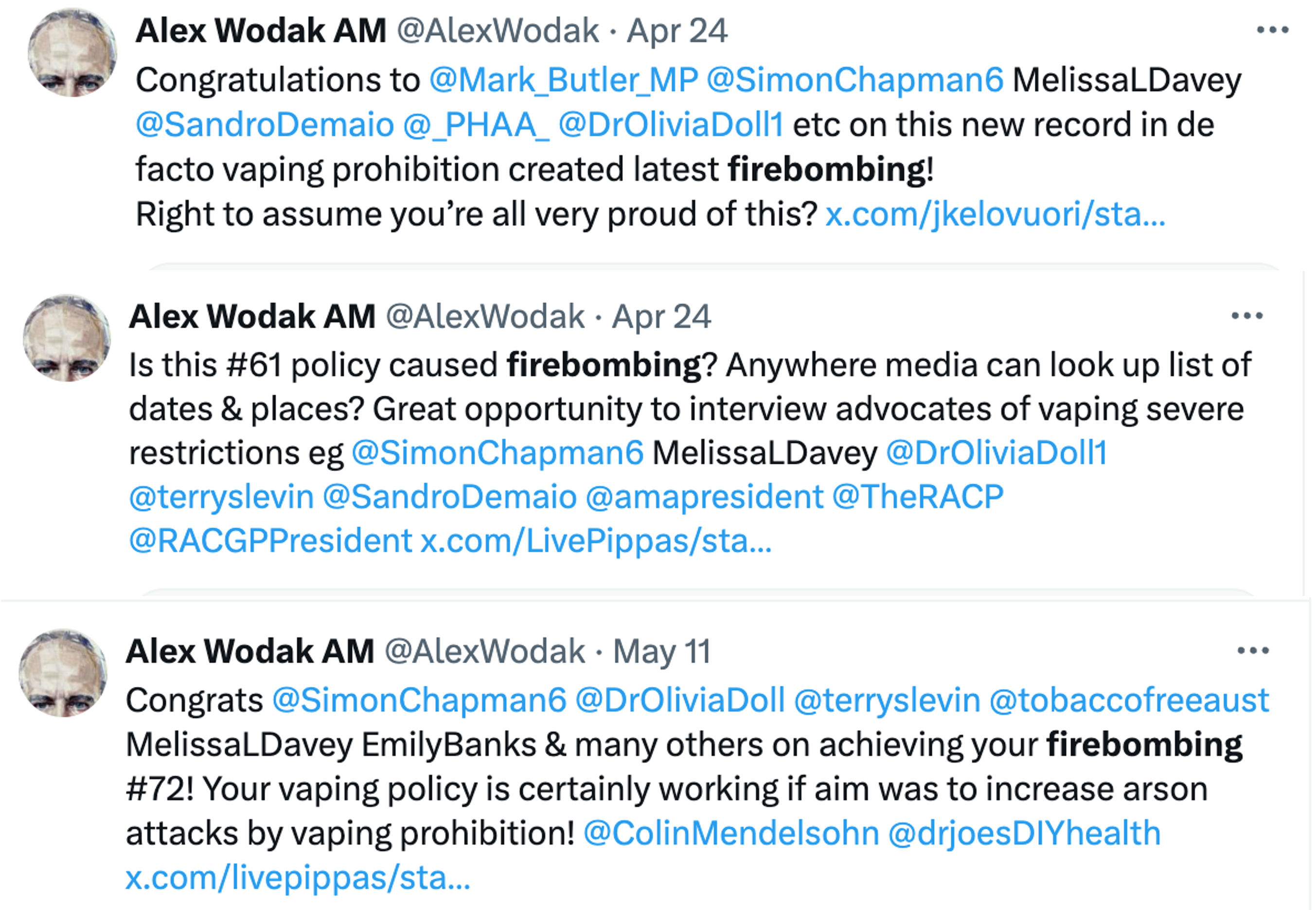In recent months Alex Wodak, a frequently professed doyen of polite, respectful debate about vaping policy, has ratcheted up his nastiness meter to 11. He’s pointed his finger at the root cause of the gang warfare and growing fire bombings of mostly Victorian shops, as well as three murders. He says the cause of all this is the galactic folly of the prescription access vape model implemented by the Morrison government from Oct 1, 2021. More precisely, it is various individuals inside and outside government who supported or reported on this model and are playing hard today inside his head (see examples below).